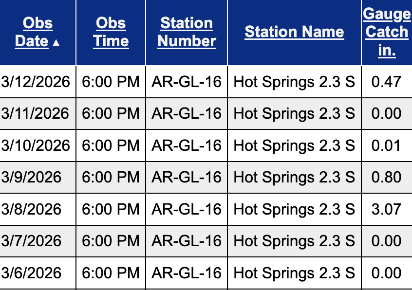 Welcome to another Weekly Wrap Up! This week saw decent temperatures and some rain across the Natural State. Here’s a look at the temperature highs and lows this week from my Tempest weather station in Hot Springs, plus here’s a look at the rain totals from my CoCoRaHS rain gauge.