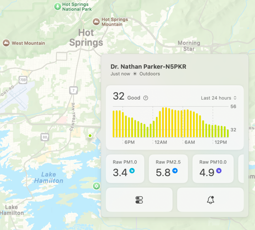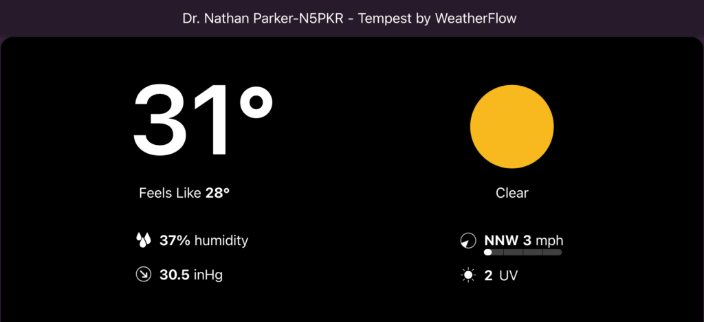 Here’s a look at the current conditions from my Tempest weather station in Hot Springs this afternoon, plus a look at the current air quality from my PurpleAir (Paku app).