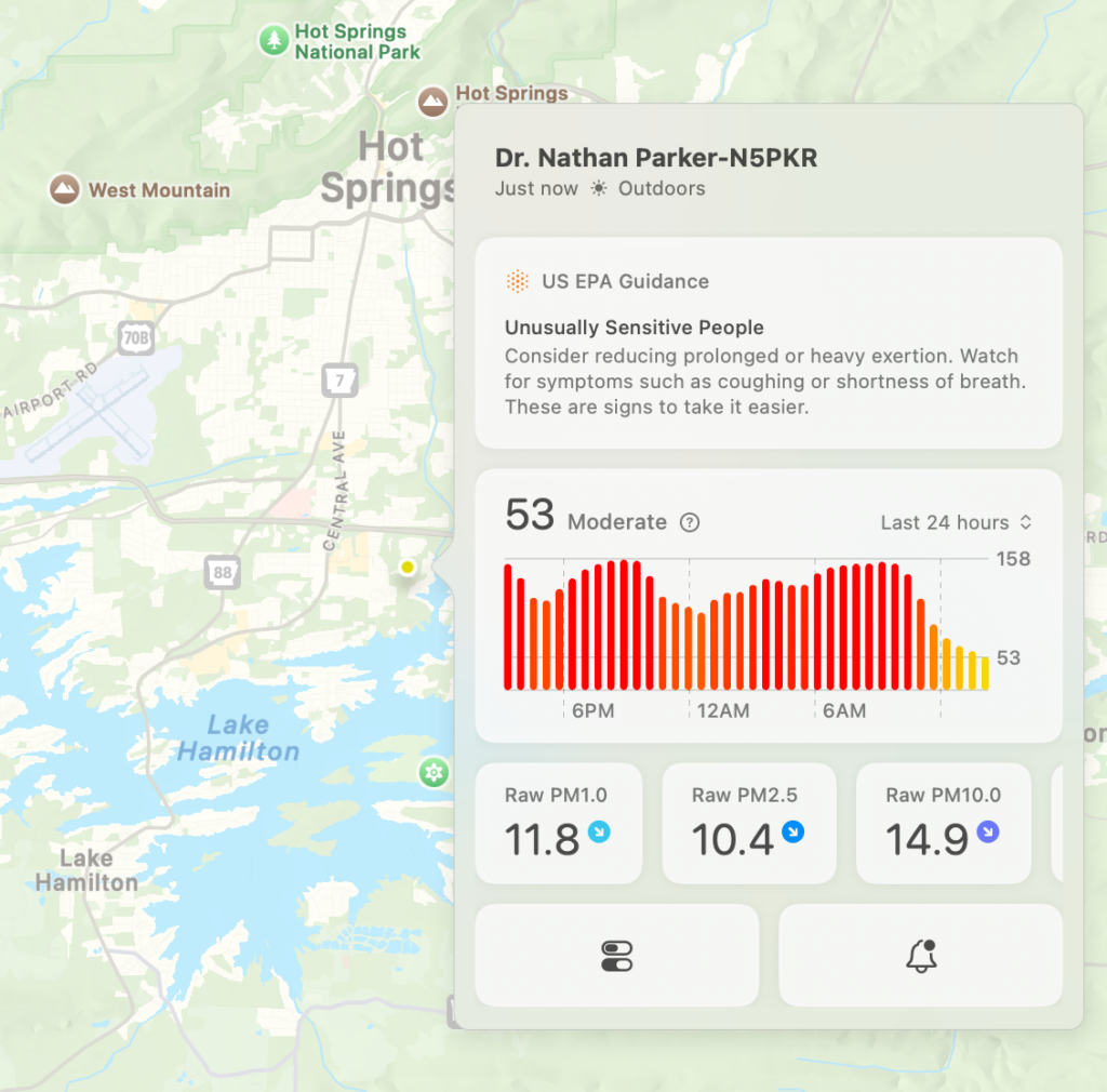 Here’s a look at the current conditions from my Tempest weather station this afternoon, plus here’s a look at the current air quality from my PurpleAir (Paku app).