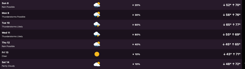 Here’s a look at the seven-day extended forecast for Hot Springs from my Tempest weather station.