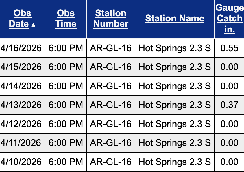 Welcome to Another Weekly Wrap Up! This week was warm and saw some rain and storms across the Natural State. Here’s a look at the temperature highs and lows this week from my Tempest weather station in Hot Springs, plus a look at CoCoRaHS rain gauge totals this week.